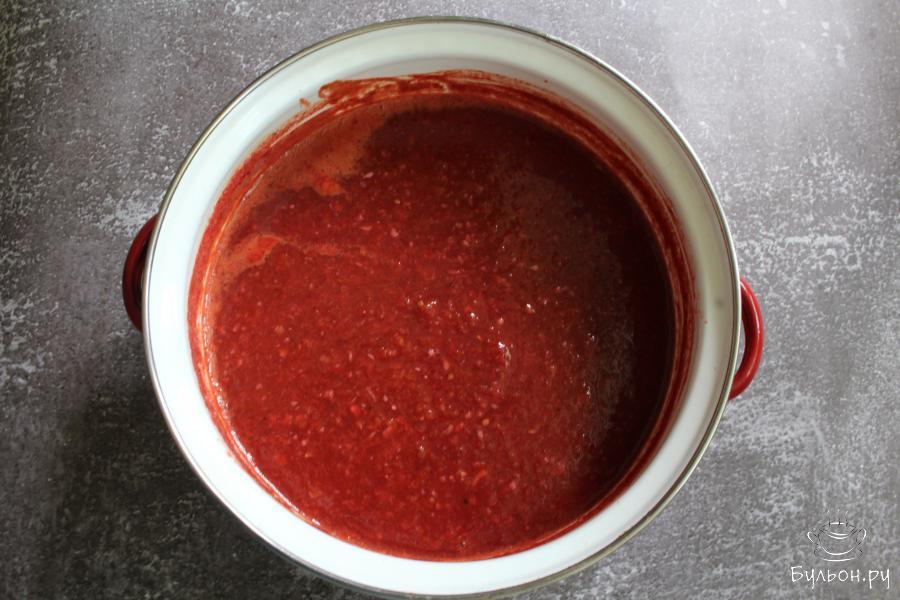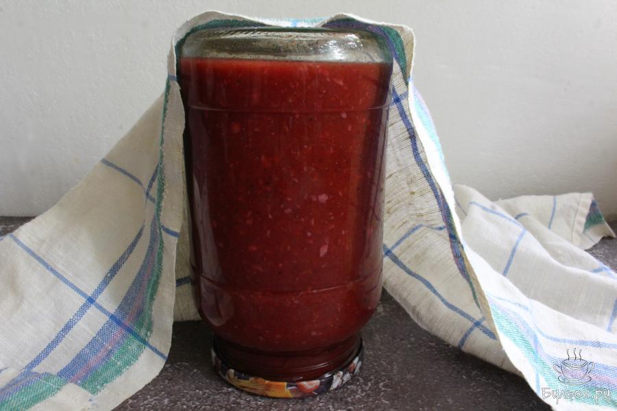 7. Разлить горячий соус в одну банку или в несколько баночек. Закрыть банку закручивающейся крышкой, перевернуть и накрыть чем-нибудь теплым.
