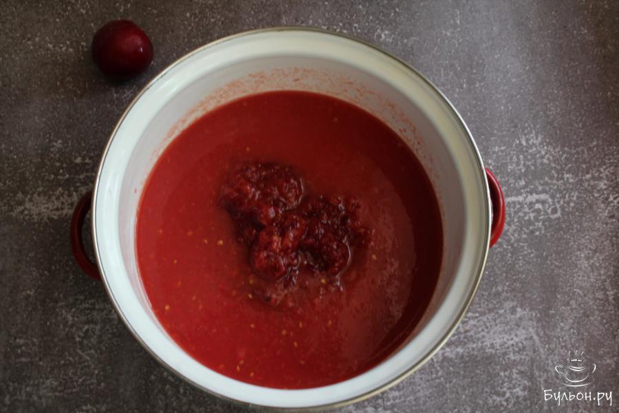 Аджика из помидоров со сливами на зиму - это пикантный и вкусный соус, который понравится многим. Такую аджику нужно приготовить хотя бы один раз и потом вам наверняка захочется повторить этот рецепт. Аджику всегда можно скорректировать под свой вкус и вкус ваших помидоров и сливы. Можно сделать аджику очень острой, более сладкой, все по желанию. Готовится соус быстро, просто. Если хочется густую аджику, то варите ее дольше. Соус порадует вас своим ярким цветом и ароматом.