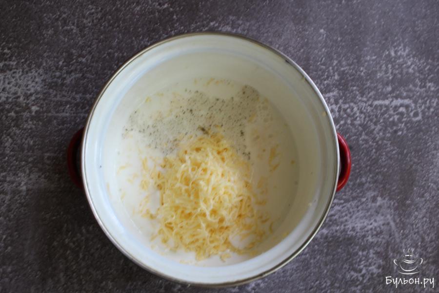 4. Сыр перетереть через мелкую терку, смешать с молоком. Помешивая, довести почти до кипения. Нужно, чтобы сыр расплавился.