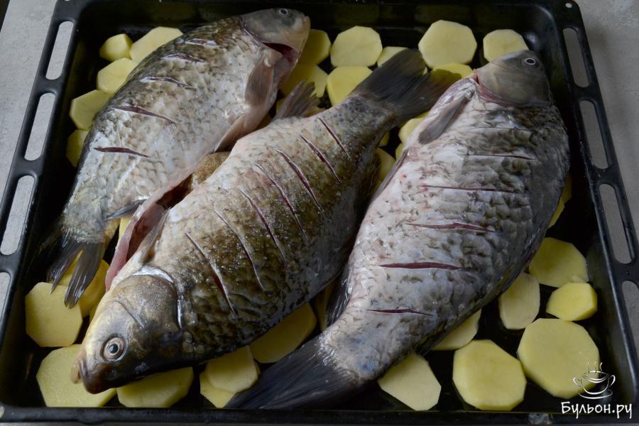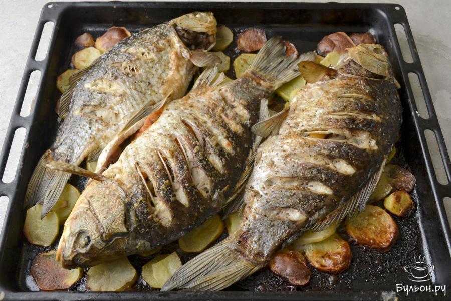 6. Переложите запеченного карася с картошкой на плоскую тарелку, добавьте к блюду любую свежую зелень и сразу подавайте к столу. Приятного аппетита!