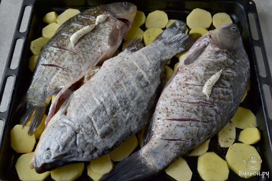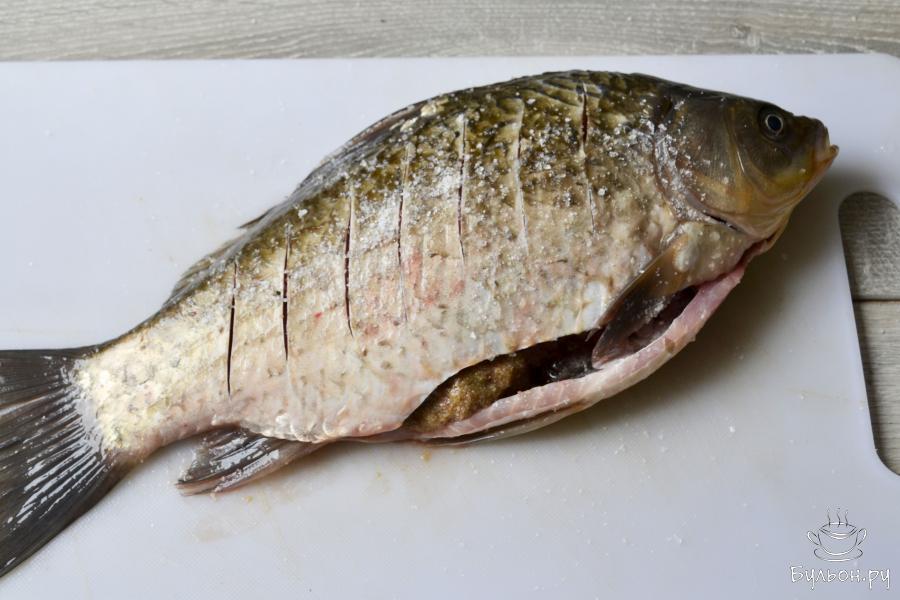 1. Рыбу тщательно вымойте, особое внимает уделите жабрам. Почистите от чешуи, распорите брюшко, удалите внутренности. Сделайте надрезы на рыбе и посыпьте солью снаружи и внутри брюшка.