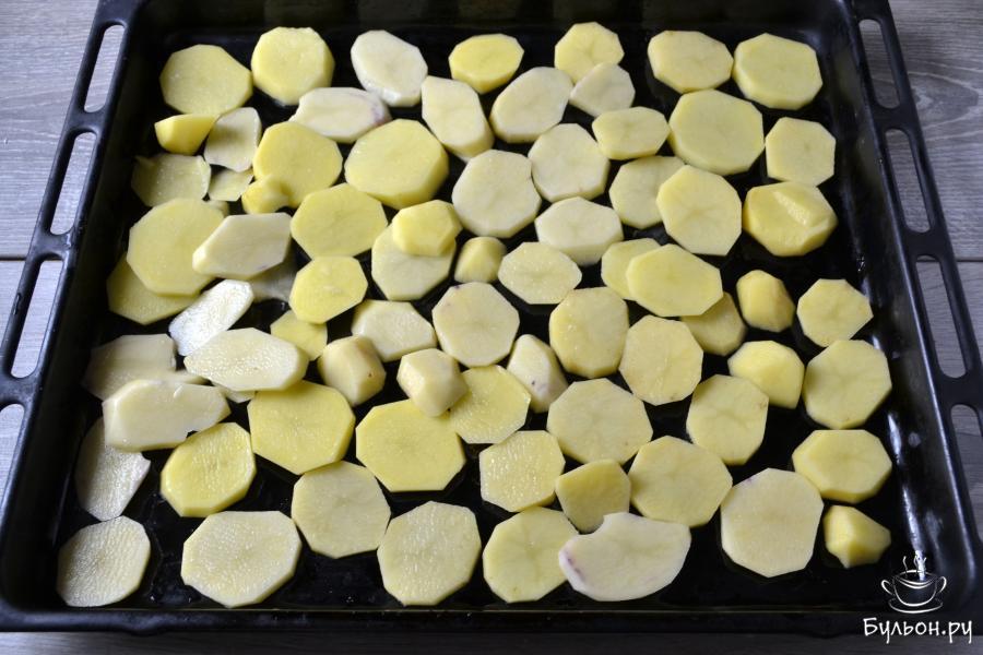 2. Картофель очистите и нарежьте тонкими кружочками. Противень смажьте растительным маслом и выложите на него кружочки картофеля. Посолите.