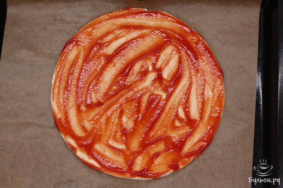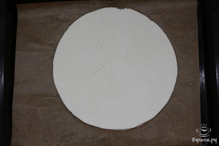 3. Рабочую поверхность присыпьте мукой, раскатайте основу для пиццы круглой формы. Переложите основу на бумагу для запекания.