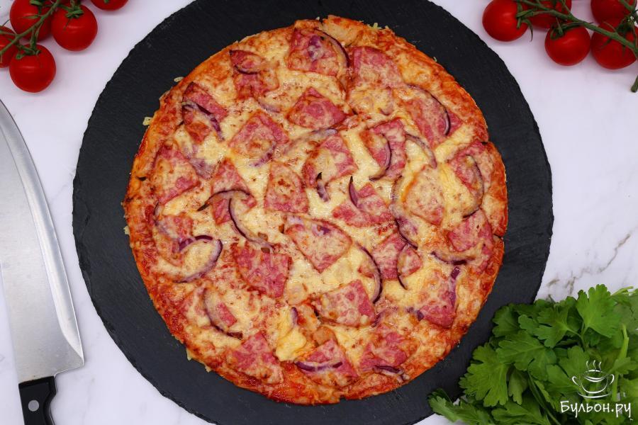 5. Натрите сыр на мелкой терке. Половину сыра посыпьте на пиццу. Лук порежьте тонкими перышками, выложите на пиццу. Колбасу порежьте на кусочки и также выложите на пиццу. Посыпьте пиццу оставшейся половиной сыра.