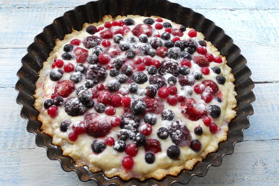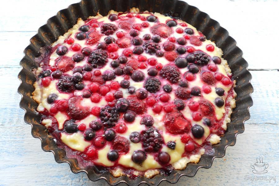 9. Форму с песочной основой вынуть из духовки и выложить подготовленную творожную начинку на тесто, сверху разместить ягоды, посыпать оставшимся крахмалом.