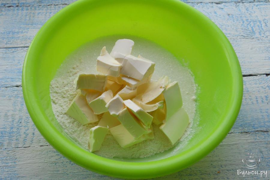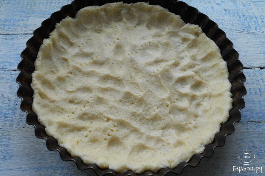 5. Затем тесто распределить по круглой форме для выпечки, растягивая его руками и формируя бортики. Поместить форму с тестом в холодильник на 30-40 минут. Далее тесто поместить в разогретую до 180 градусов духовку, выпекать 15 минут.