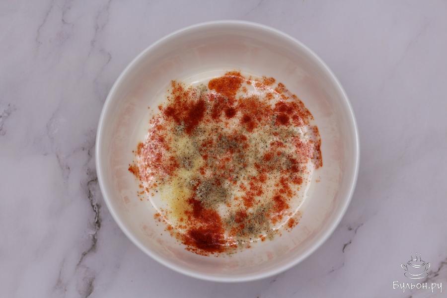 2. Приготовьте кефирный маринад. Для этого в миску влейте кефир, добавьте паприку, чеснок сушеный, черный молотый перец и соль. Все хорошо перемешайте.