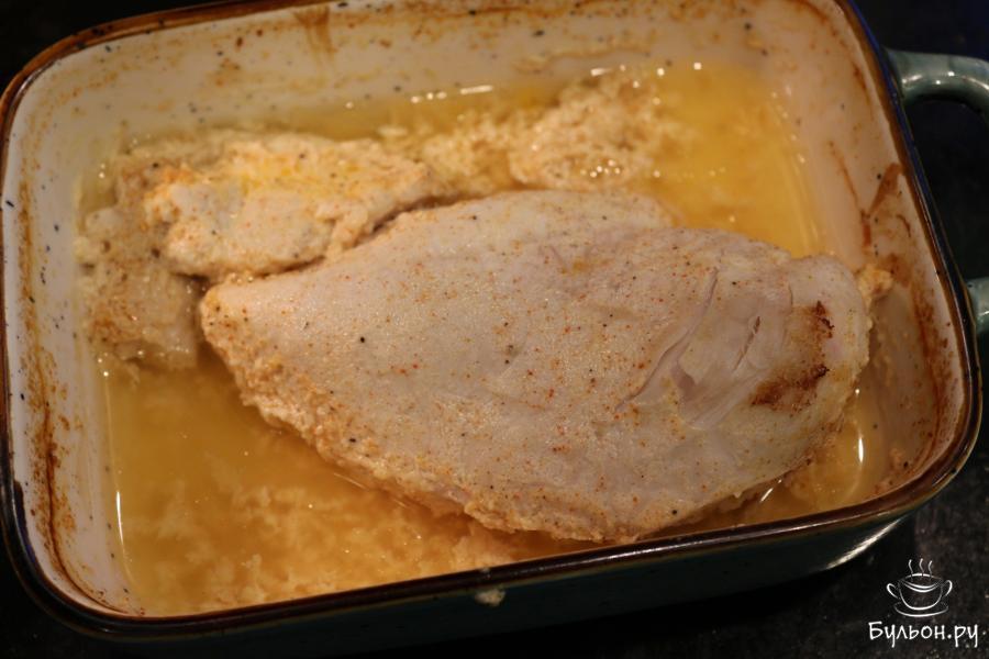 4. Переложите куриное филе в форму для запекания и влейте кефир со специями, в котором мариновалось филе. Форму закройте фольгой.
