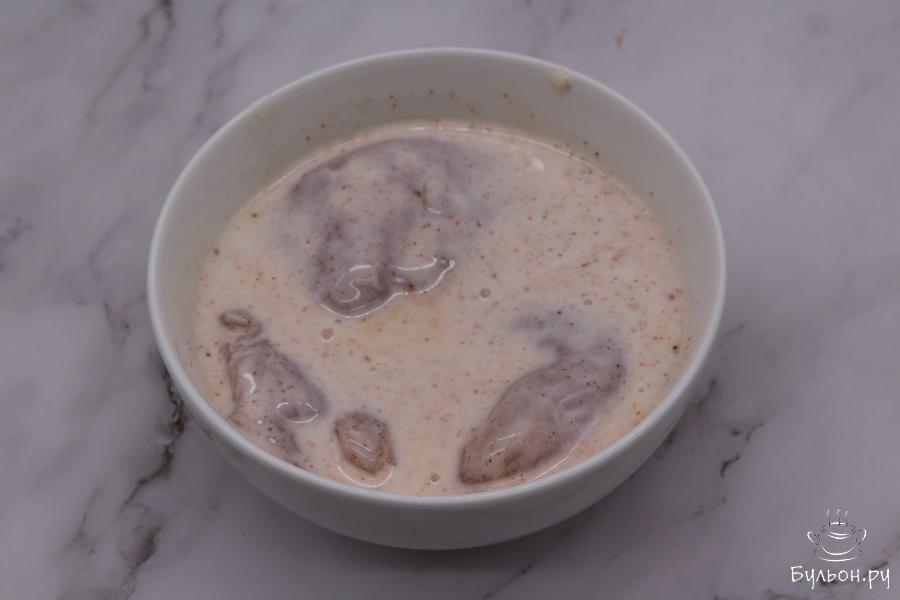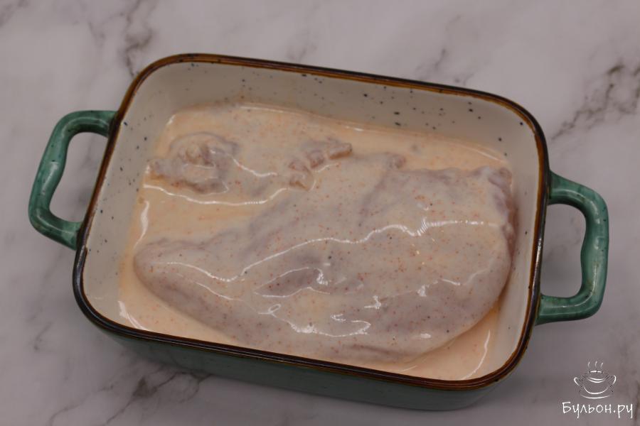 3. Положите филе в кефир, накройте миску пленкой и поставьте мариноваться в холодильник на один час.