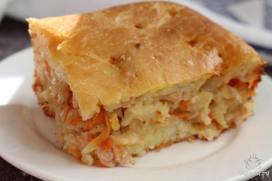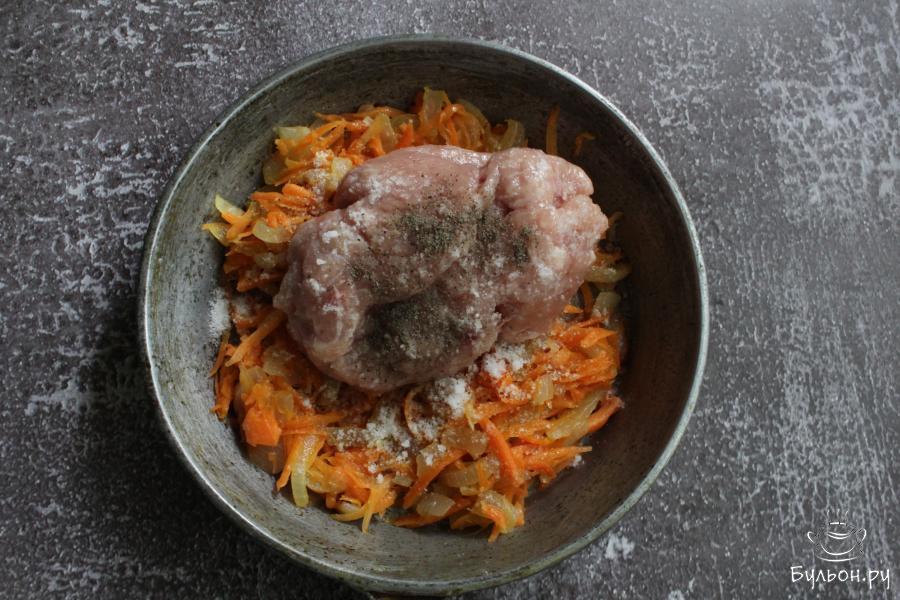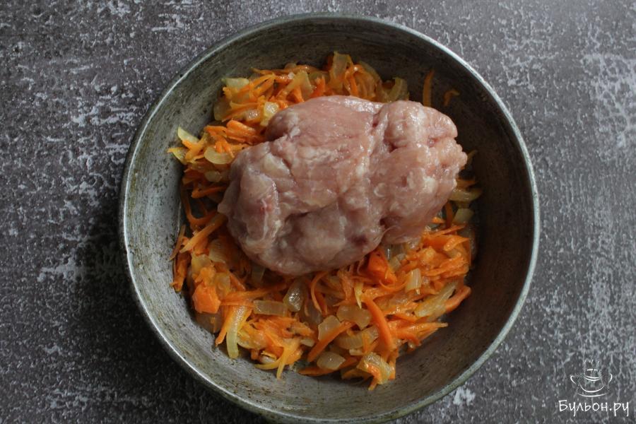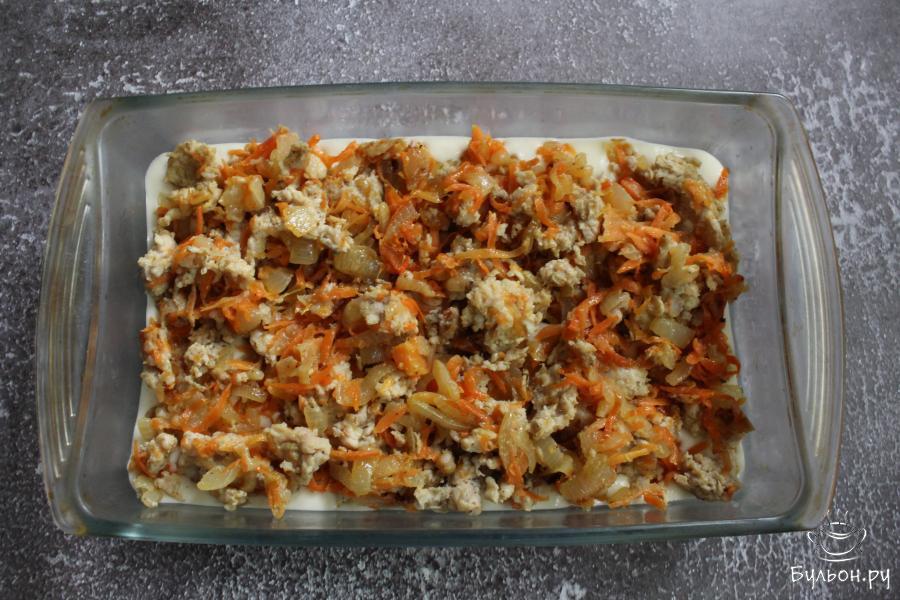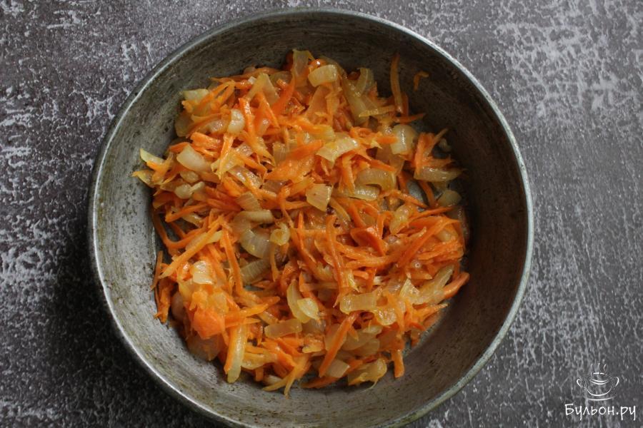 1. Приготовить начинку. Лук мелко нарезать, морковь перетереть через крупную терку. Обжарить овощи, до мягкости, на сковороде с 1 ст. л. разогретого масла.