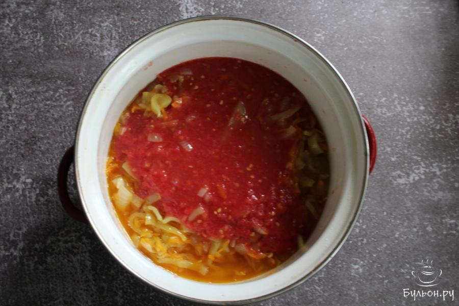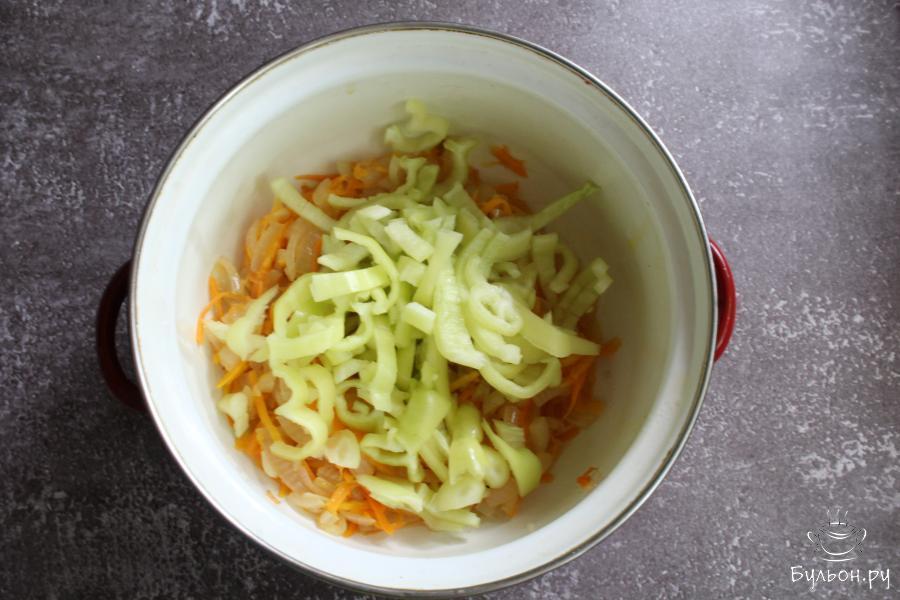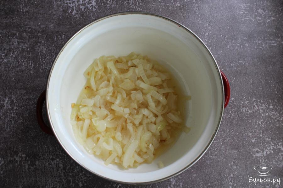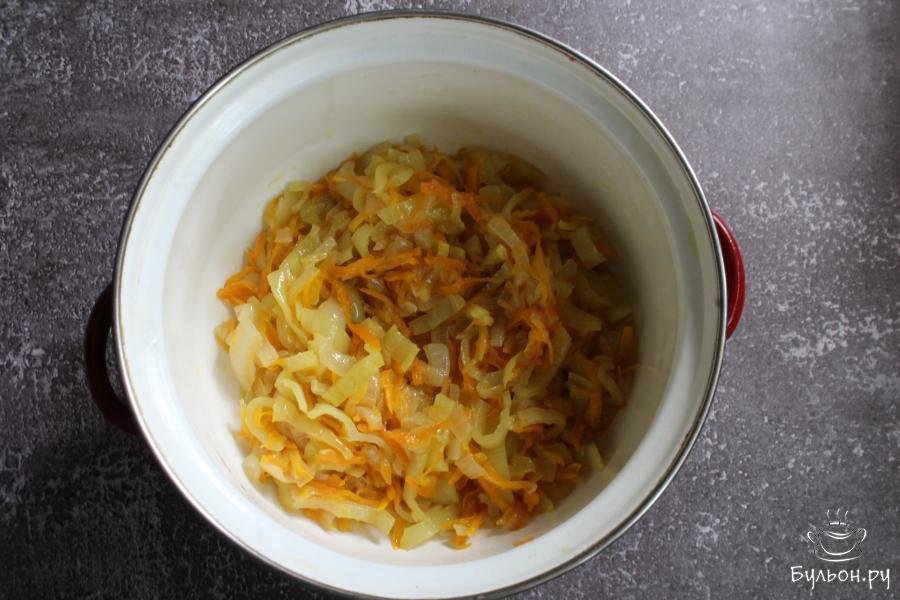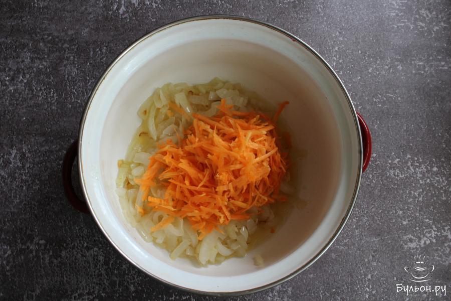 2. Очищенную морковь перетереть через крупную терку, добавить к луку и обжарить все вместе 6-7 минут.