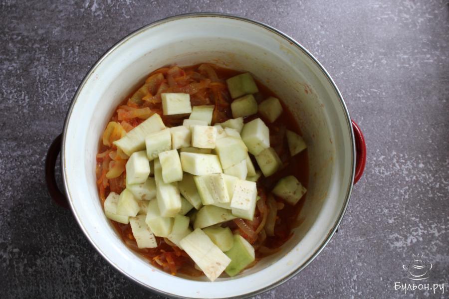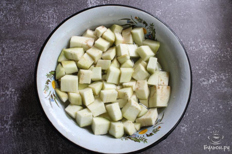 7. Баклажаны почистить, нарезать кубиками и залить крепко соленой водой. Пусть полежат в соленой воде минут 10.