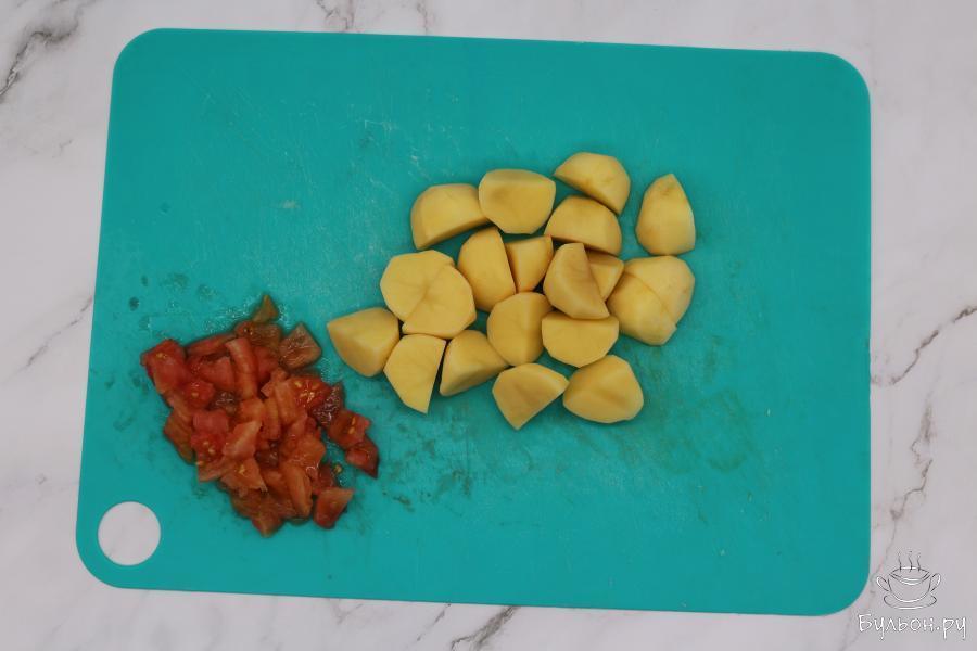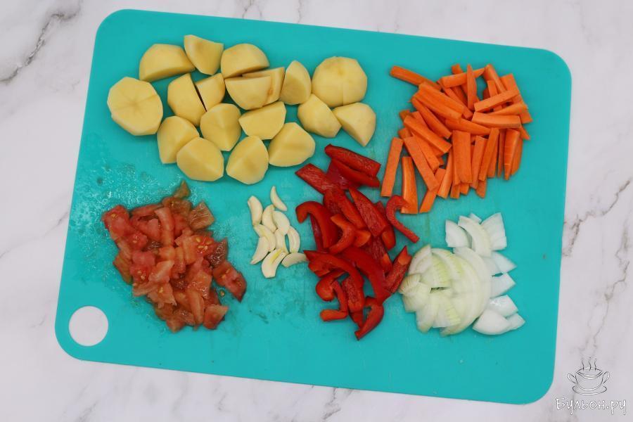 1. Подготовьте все овощи, вымойте их и очистите. Морковь, перец нарежьте брусочками. Картофель разделите на 4 части. Лук нарежьте перьями, дольки чеснока порежьте на пластины. Помидор очистите от кожицы нарежьте кубиками.