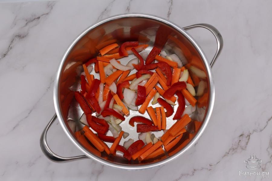 2. В кастрюлю влейте растительное масло, нагрейте его. Затем выложите лук, чеснок, морковь и перец прямо в масло, обжарьте, затем достаньте из масла.