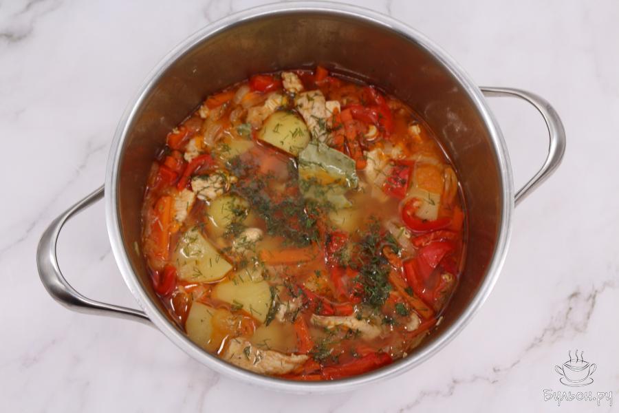 7. В конце приготовления добавьте лавровый лист и зелень. Оставьте суп настояться еще минут 10-15. Суп из овощей и курицы готов.