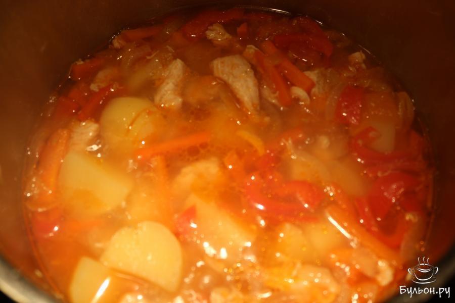 6. Посолите и добавьте столько воды, сколько ее необходимо по вашему мнению. Доведите суп до кипения, убавьте огонь и томите его под крышкой еще 25 минут.