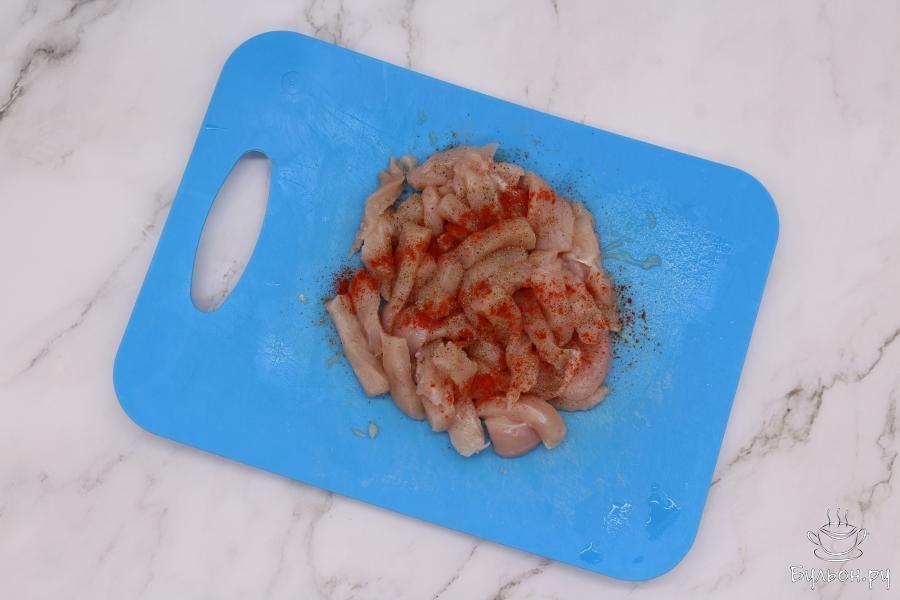 3. Нарежьте курицу на кусочки и добавьте специи по вкусу. Например, это может быть паприка, черный молотый перец, хмели-сунели. Выложите курицу в кастрюлю, обжарьте. Залейте водой, так чтобы все кусочки курицы были ей покрыты, перемешайте, накройте крышкой и тушите треть часа на среднем огне.