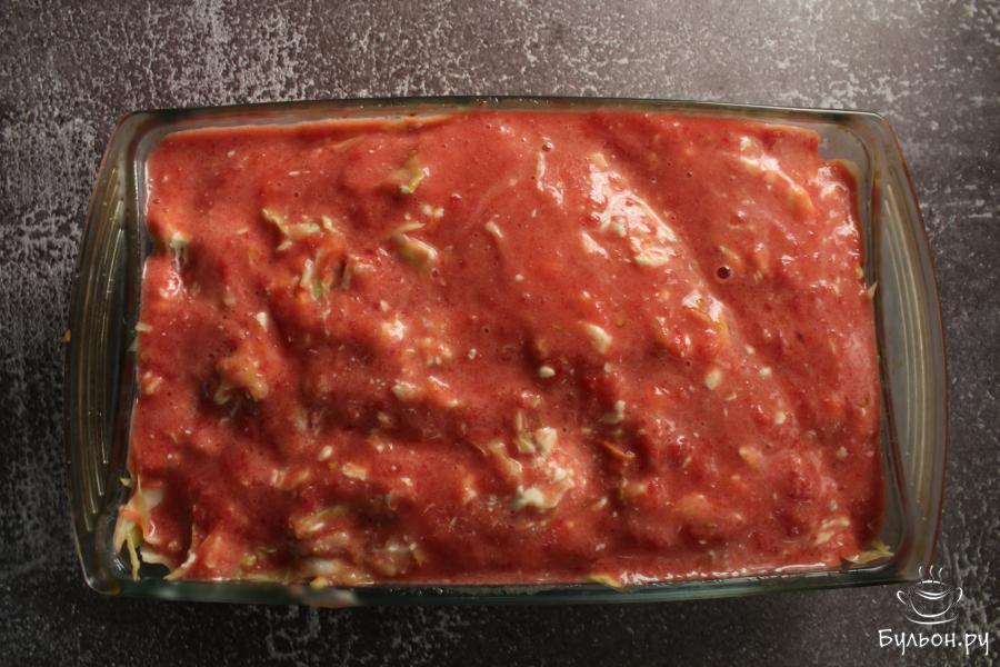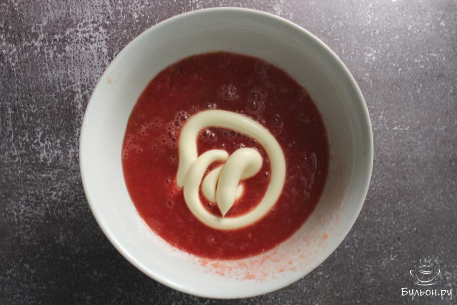 7. Отдельно в миску перетереть через терку помидоры, добавить к томатной массе майонез, 150 мл. воды, соль и хорошо перемешать.