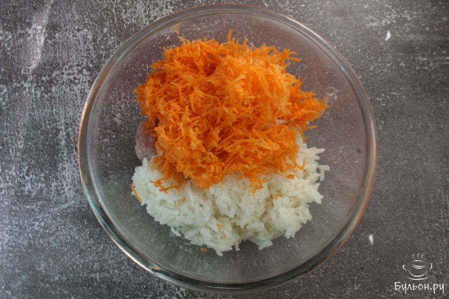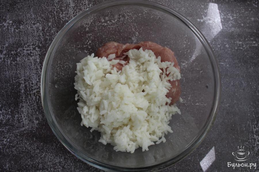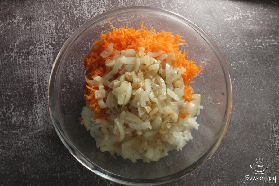 4. Лук мелко нарезать, обжарить на сковороде с разогретым маслом, до румяного цвета и добавить лук к фаршу.