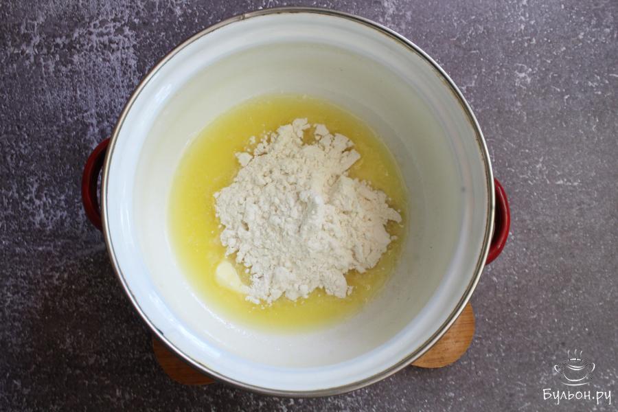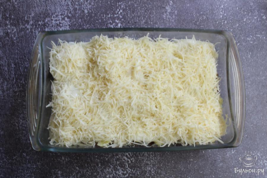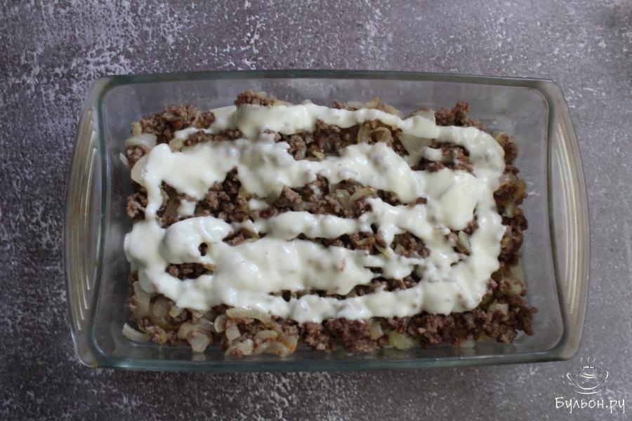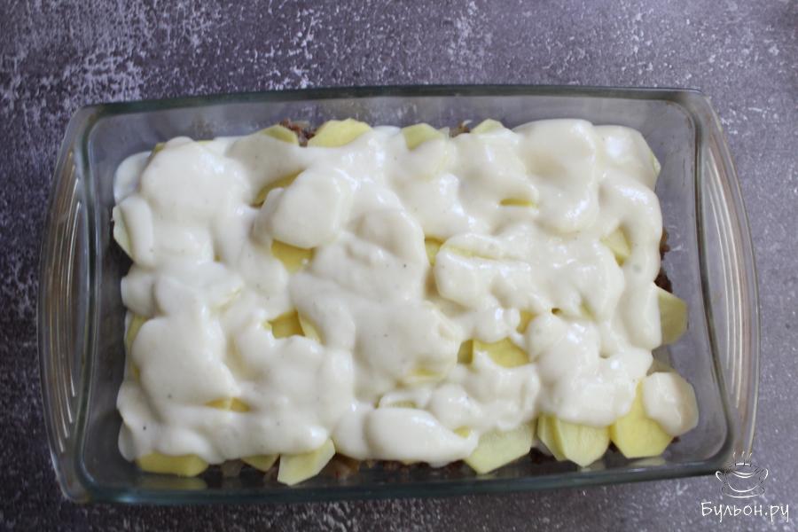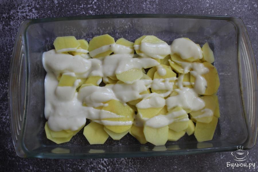 6. Очищенный картофель нарезать тонкими кружочками и выложить половину в форму для запекания. На картофель выложить часть соуса. Соль можно добавить в соус, можно подсаливать слои.