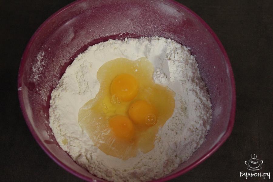 2. Просейте муку через сито, вбейте 3 яйца и перемешайте до состояния крошки. В зависимости от сухости крошки, добавьте в тесто 1-2 ч. л. ледяной воды.