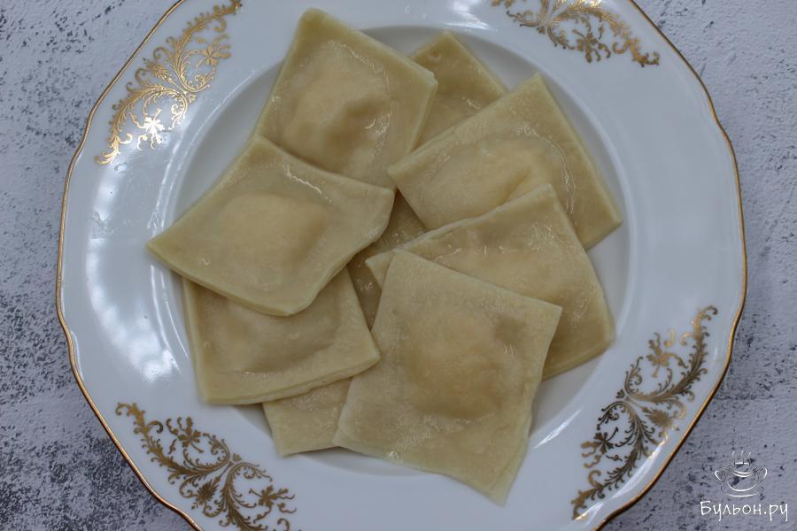 7. Отварите равиоли в кипящей, подсоленной воде, в течение 4-5 минут и подайте на стол с любимым соусом.