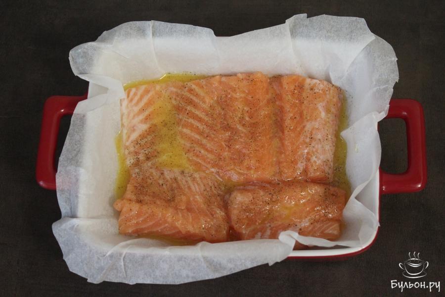 1. Красную рыбу разделайте на филе, убрав косточки и срезав со шкурки. Дно формы для запекания покройте пергаментом, сверху выложите рыбу, смажьте ее растопленным сливочным маслом, поперчите и посолите. Запеките рыбу в духовке, в течение примерно 15 минут, при 200 градусах.