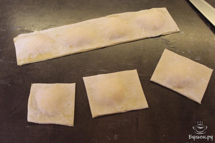 6. Накройте сверху другой полоской теста, прижмите пальцами пространство вокруг начинки и нарежьте квадратиками.