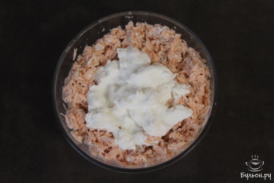 4. Остывшую рыбу поломайте с помощью вилки на небольшие кусочки. Добавьте рикотту, посолите и перемешайте.