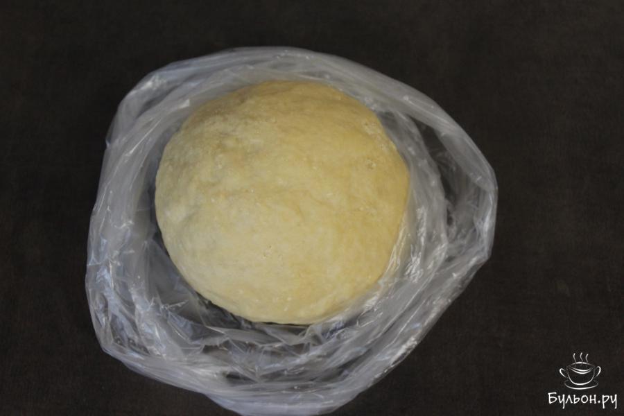 3. Пересыпьте мучную крошку на рабочую поверхность и домесите тесто до эластичного состояния. При необходимости можете подсыпать немного муки. Вымешенное тесто переложите в полиэтиленовый пакет и оставьте на 30 минут.