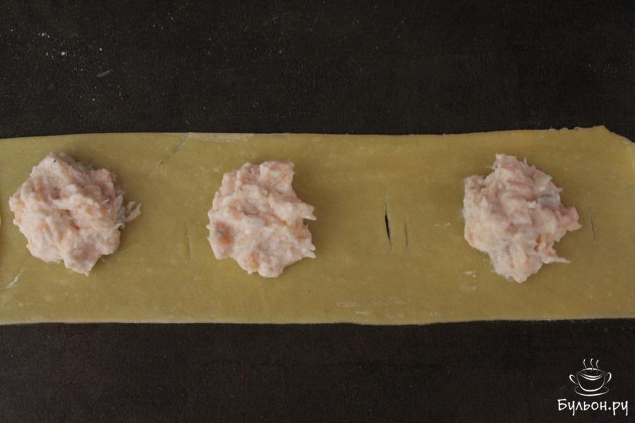 5. Отдохнувшее тесто раскатайте и нарежьте на длинные полоски шириной примерно 6 см. Смажьте слегка взбитым яйцом и положите вдоль полоски теста по 1 ч. л. рыбной начинки, на расстоянии примерно 6 см. друг от друга.
