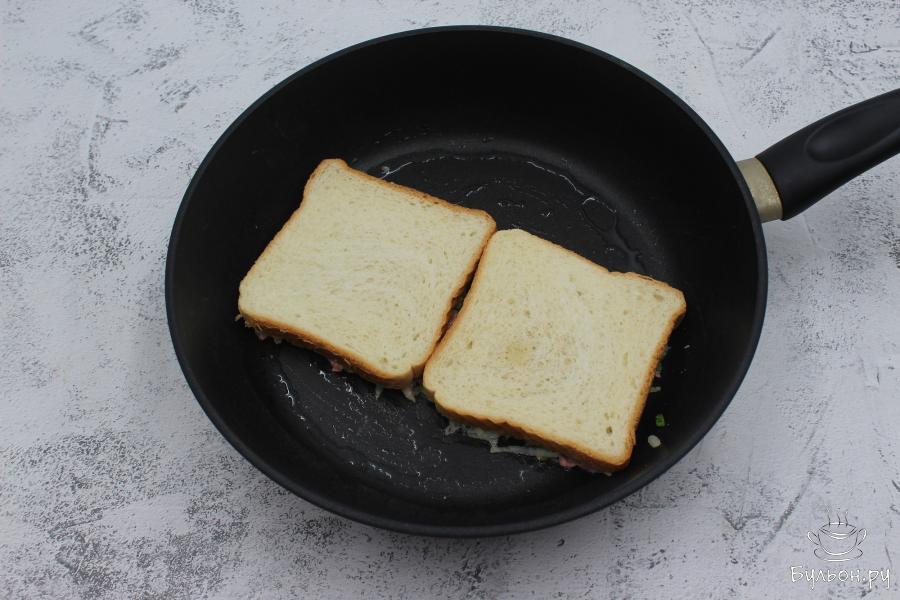 4. Начинкой вниз выложите бутерброды на хорошо прогретую сковороду с небольшим количеством растительного масла. Обжарьте до румяной корочки.