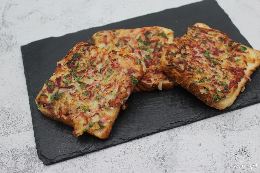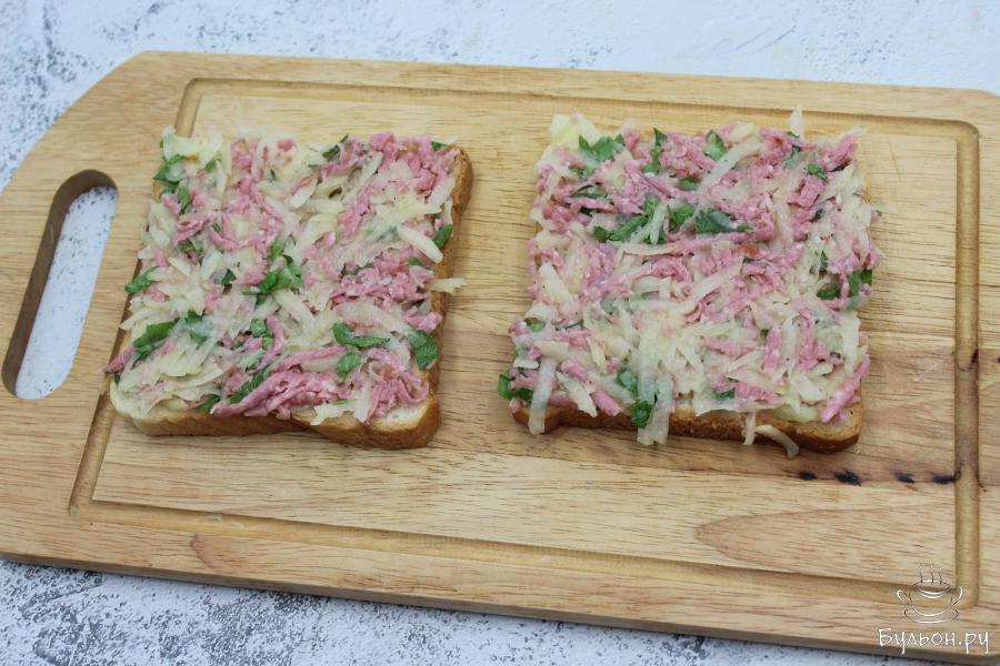 3. На ломтики батона выложить картофельно-колбасную массу и, слегка прижимая к хлебу, распределите ее по бутерброду.