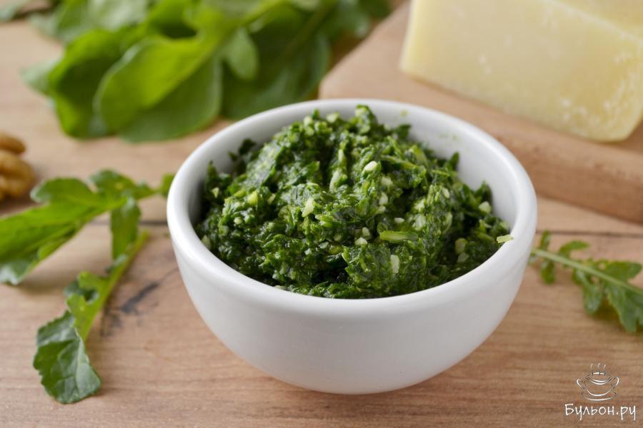 4. Песто из рукколы имеет чуть горьковатый вкус, который хорошо смягчается сыром и оливковым маслом. Песто можно добавить к макаронам, мясу, вареному картофелю, в овощной салат или просто положить на кусочек хлеба. Приятного аппетита!