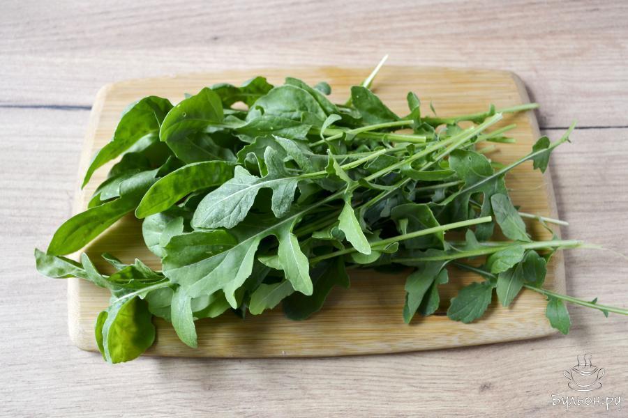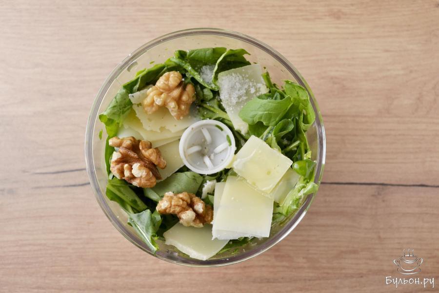 2. В чашу миксера положите рукколу, грецкие орехи, нарезанный на тонкие пластинки сыр Пармезан и соль.