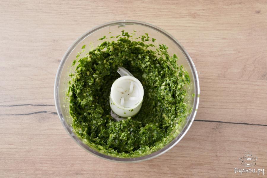 3. Насадкой "металлический нож" измельчите ингредиенты до однородной кашеообразной консистенции. Влейте оливковое масло и еще раз измельчите. Соус песто из рукколы готов.