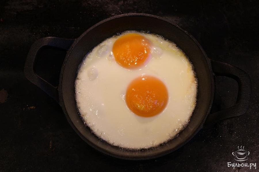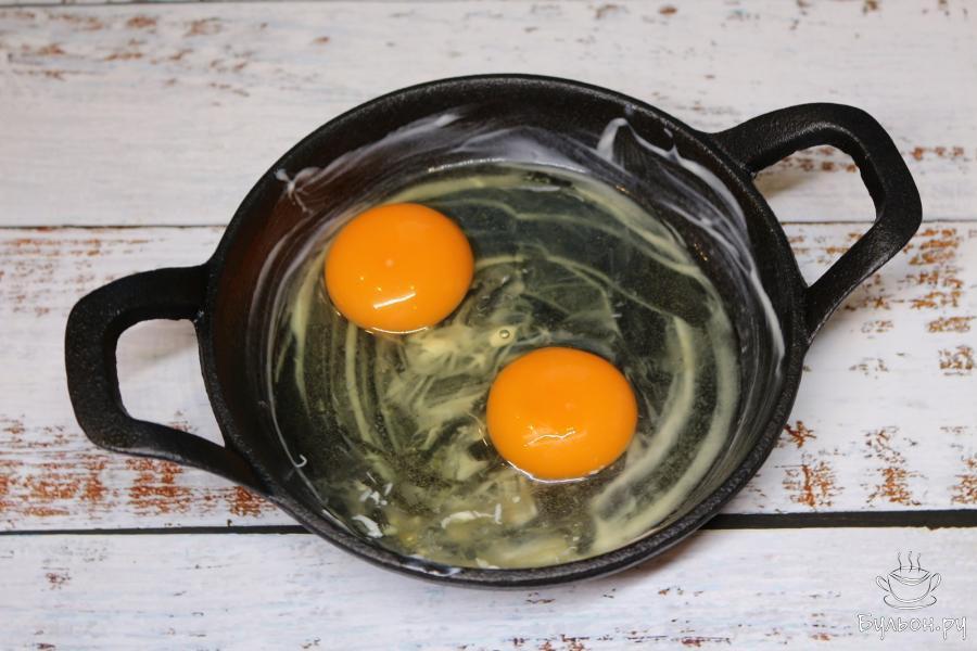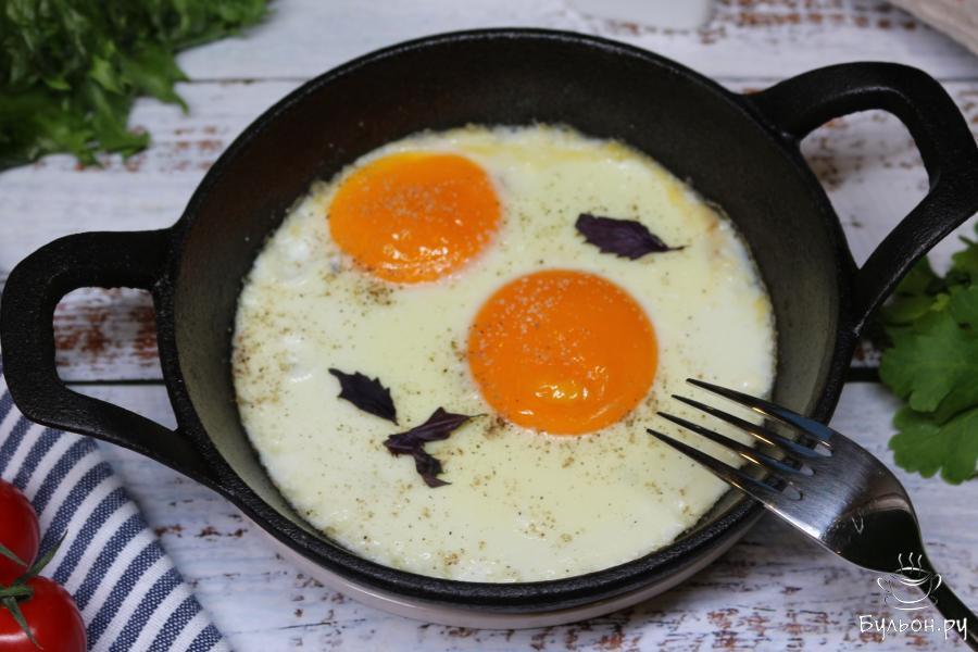 4. Сковороду поставьте в уже разогретую духовку. Готовьте при 190 градусах от 7 до 10 минут. Следите за внешним видом яичницы, белок должен схватиться, желток должен остаться жидковатым внутри. Если он полностью сварится, будет не так вкусно. Время приготовления зависит от посуды и количества яиц.