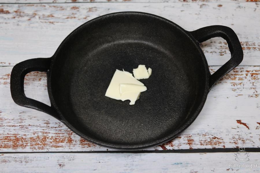 2. Возьмите маленькую чугунную сковородку или другую, любую форму для запекания и обильно смажьте ее кусочком сливочного масла.