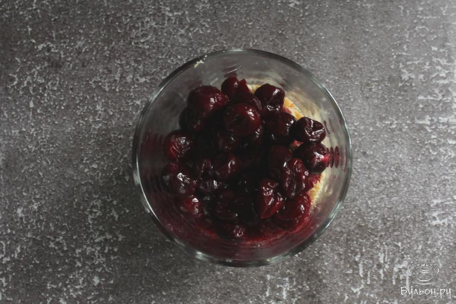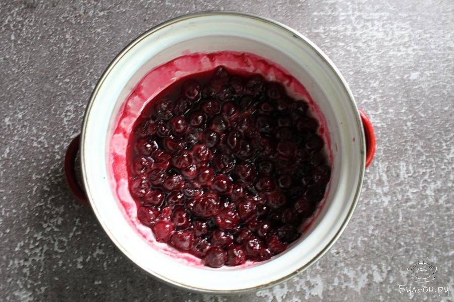 1. Вишню промыть и почистить от косточек. Выложить вишню в кастрюльку, добавить сахар и ванильный сахар.