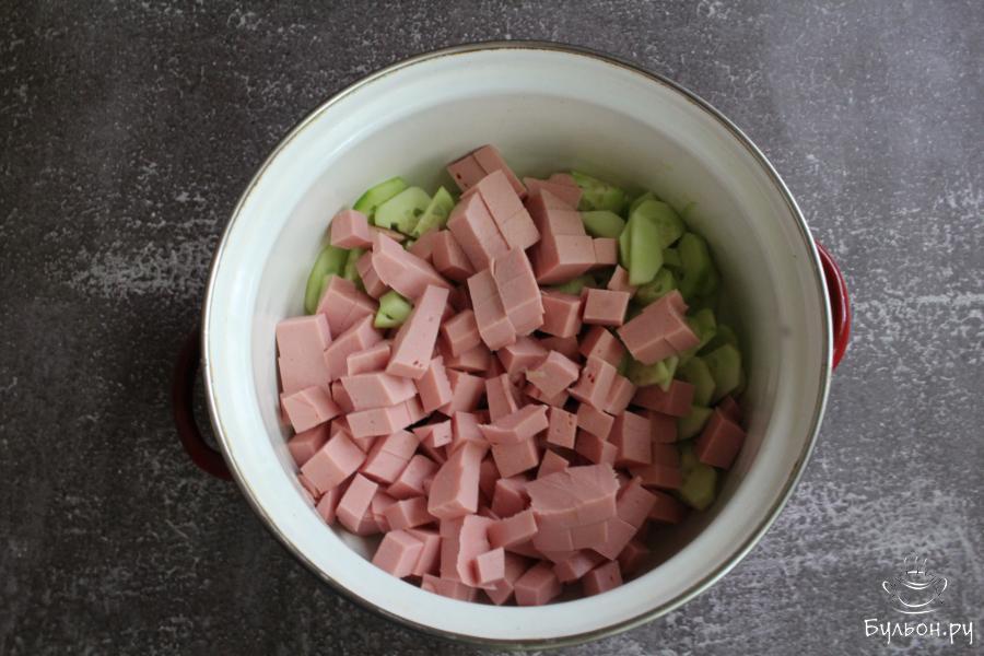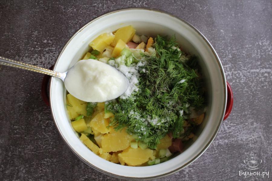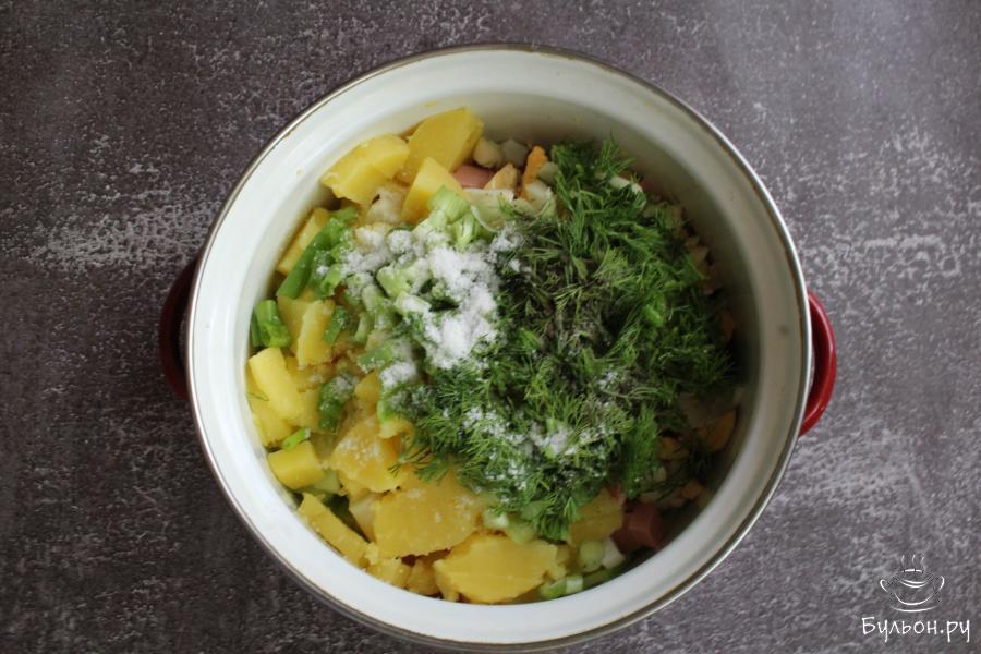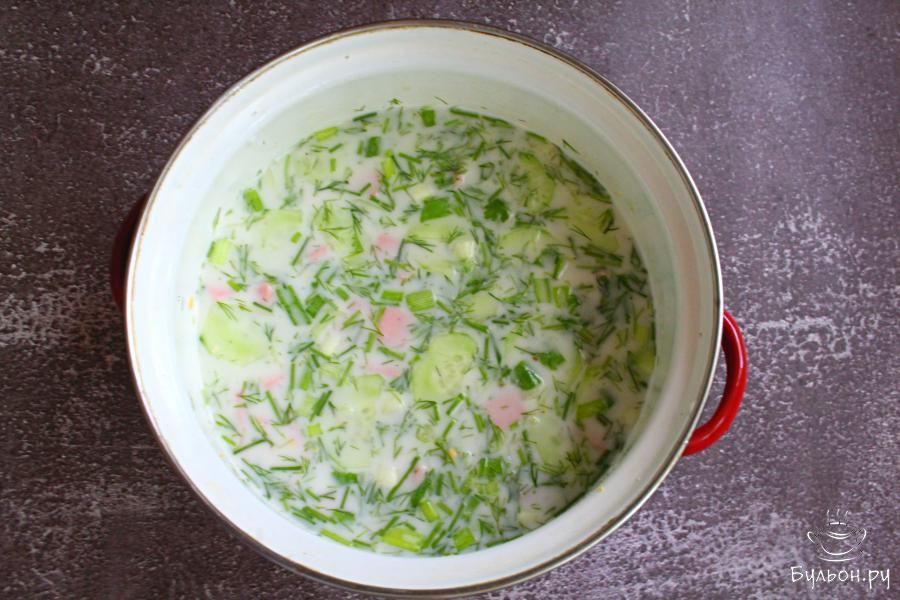 7. Добавить в кастрюльку минеральную воду без газа. Воды добавить до нужной консистенции окрошки. Перемешать, попробовать и если нужно досолить.