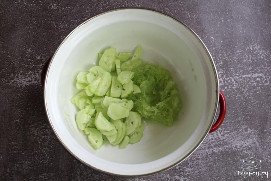 2. Огурцы почистить от кожицы. Один огурец перетереть через мелкую терку, он добавит окрошке аромат и густоту. Остальные огурцы нарезать тонкими полукружочками.