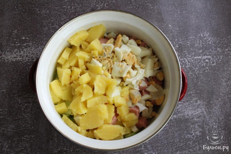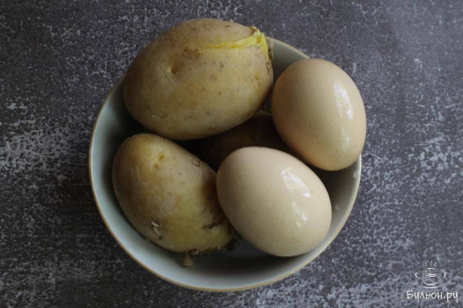 1. Картофель сварить в мундире до готовности. Яйца сварить вкрутую. Остудить и почистить яйца и картофель.