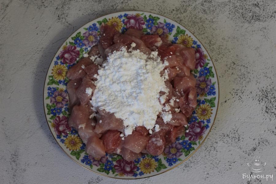 1. Нарезанную кубиками свинину, посолите и обваляйте в картофельном крахмале. Обжарьте до золотистой корочки на растительном масле, на сильном огне. Переложите обжаренное мясо в чистую тарелку.