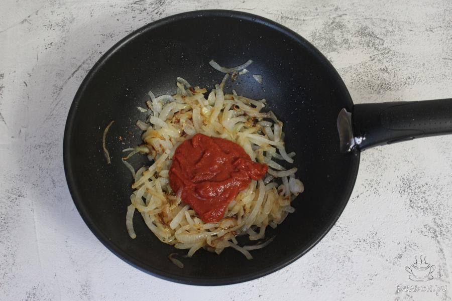 2. На этой же сковороде обжарьте перья репчатого лука, до золотистого цвета. Добавьте томатную пасту и жарьте еще 2 минуты.