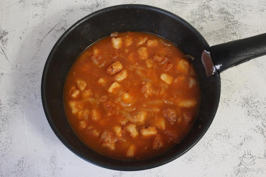 3. В сковороду к луку с томатной пастой, выложите кусочки свинины, влейте кипяток, добавьте соли и тушите, не закрывая крышкой, примерно 10 минут.