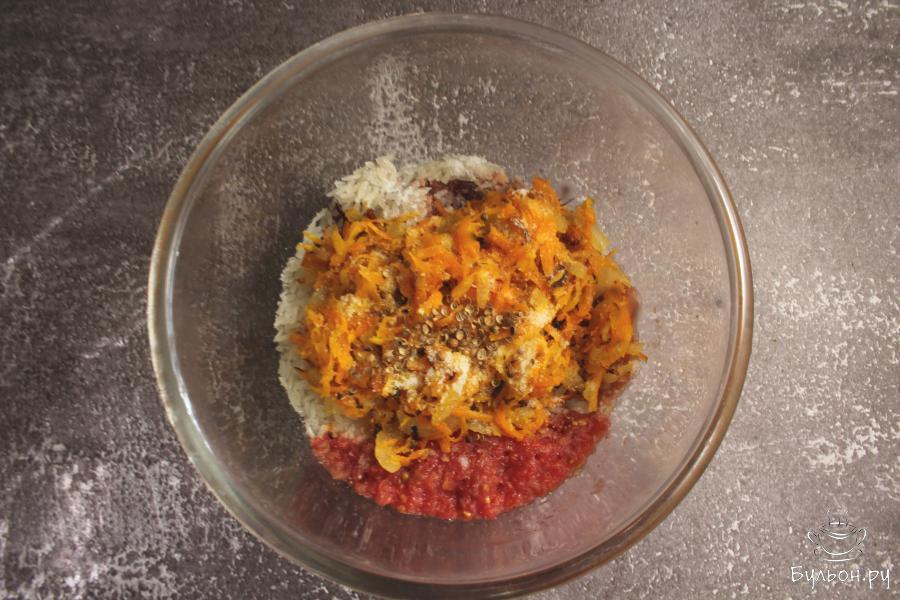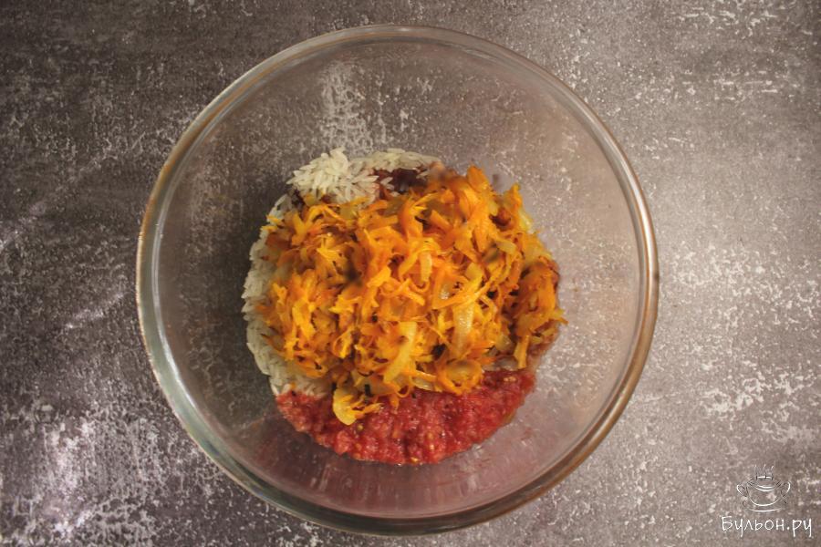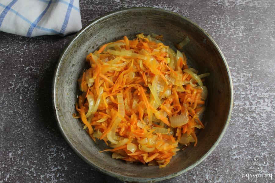 1. Очищенный лук мелко нарезать, очищенную морковь перетереть через крупную терку. Обжарить овощи, до мягкости, на растительном масле.