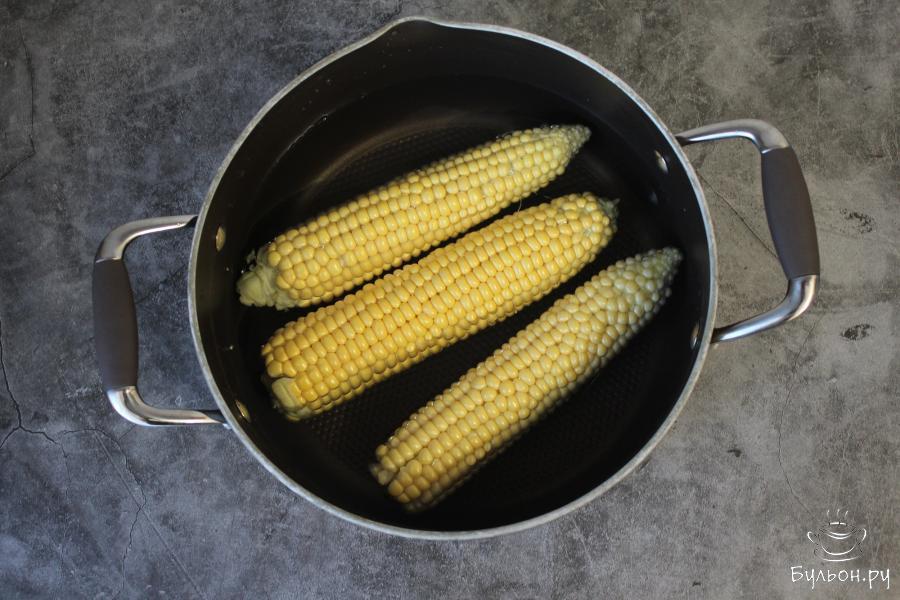 1. Кукурузу в початках очистить, промыть под водой, переложить в кастрюлю, залить водой и поставить на огонь. Варить кукурузу примерно 30-45 минут.