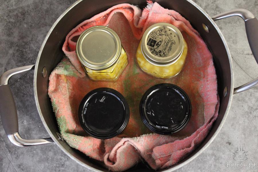 5. Взять кастрюлю, на дно выложить мягкую ткань и установить баночки с кукурузой. Залить банки, по плечики, водой. Поставить кастрюлю на плиту, довести воду до кипения, а затем варить кукурузу 40 минут, при непрерывном кипении.