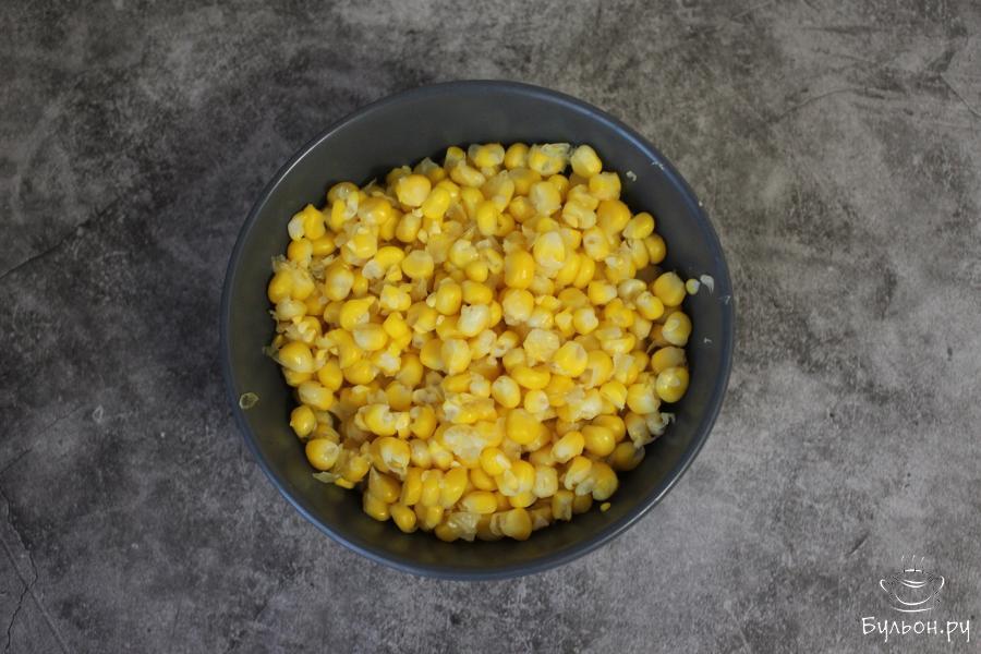 3. Сваренную кукурузу снова промыть под проточной водой, а затем аккуратно счистить зерна, помогая себе ножом и руками.