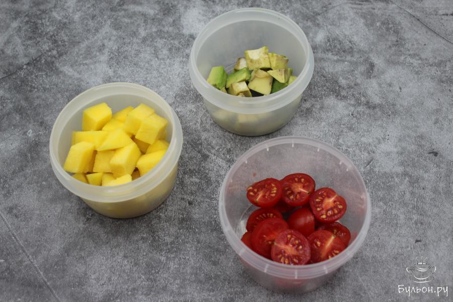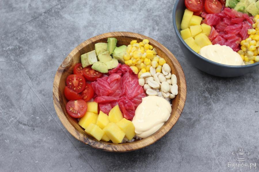 5. Сверху выложите все продукты, то есть нарезанную слабосоленую рыбку, кубики авокадо и манго, половинки черри, консервированную кукурузу, арахис, добавьте соус спайси. Поке с лососем подайте к столу.